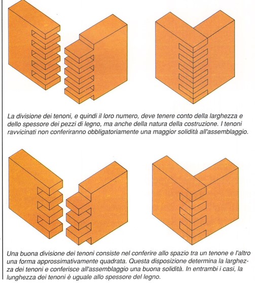 Tutti i tenoni devono presentare la stessa larghezza. A seconda del tipo di mobile, i tenoni saranno più o meno distanti. ma sempre abbastanza vicini per potere conferire una buona solidità all’assemblaggio. Per esempio, per una tavola di legno con una larghezza di 15 cm e uno spessore di 3 cm, la larghezza di un tenone e quindi quella dello spazio compreso tra due tenoni, sarà di 3 cm. Due tenoni più ravvicinati non permetterebbero all’assemblaggio di avere una maggiore stabilità. Una disposizione simile, al massimo, conferirebbe un aspetto più estetico alla realizzazione: questa soluzione potrà essere utilizzata se gli assemblaggi dovranno rimanere visibili.