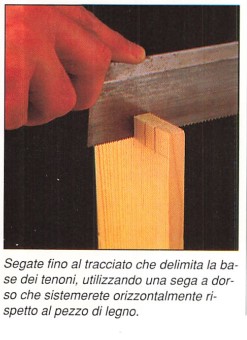 Il tratto con la sega dovrebbe essere utilizzato per cominciare a formare i tenoni e a liberare gli intagli intermedi. Cominciate a realizzarlo appoggiando la lama della sega sul tracciato e tirando l’utensile verso di voi. Per evitare che la sega scivoli, appoggiate l’unghia del pollice contro la lama, effettuando diversi passaggi fino a che la lama non penetri perfettamente nel legno. Cominciate allora a segare con un movimento di va e vieni. Riportate progressivamente la sega in posizione orizzontale, tenendola in posizione perpendicolare rispetto al pezzo di legno. Continuate in questo modo fino a quando non raggiungerete il tracciato che delimita la lunghezza dei tenoni. Fermatevi un po’ prima, anche se dovrete poi rifinire il taglio con lo scalpello.