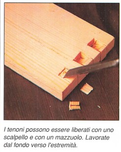 L’intaglio si propone di rifinire la formazione dei tenoni. Consiste nel togliere tutte le parti tratteggiate con uno scalpello, che colpirete leggermente sul manico con un mazzuolo.