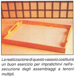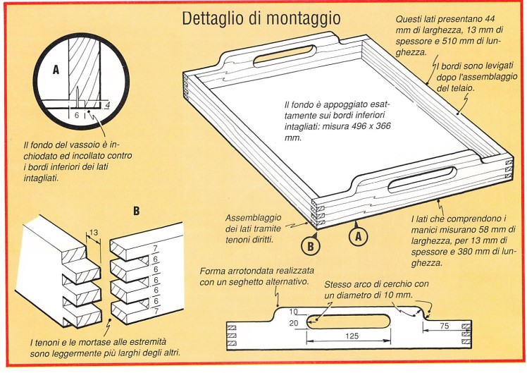 Ecco un’idea per mettere in pratica le vostre nuove conoscenze: un vassoio in legno per sparecchiare la tavola o per servire la prima colazione. Non deve certo sostenere pesi incredibili, ma deve essere in ogni caso abbastanza resistente. I lati di questo vassoio sono assemblati a tenoni multipli, un metodo di incastro più solido e più estetico rispetto ad un assemblaggio ad angolo incollato ed inchiodato. L’incastro a tenoni multipli negli angoli, rinforzato da un’incollatura, si dimostra, in questo caso, il più adatto. Per i lati, abbiamo utilizzato listelli di abete, con uno spessore di 13 mm e con una larghezza di 44 mm, per due di loro. Gli altri due, comprendenti i manici, sono realizzati con due listelli con una larghezza di 58 mm. Questa differenza è data dalla presenza dei manici, che impongono un taglio incurvato (vedere schema sotto). Realizzate i due manici insieme, riunendo i due lati, per ottenere una simmetria perfetta. Lo spessore del legno utilizzato determina la lunghezza dei tenoni, tre o quattro a seconda dei pezzi. Di conseguenza, i tenoni e gli intagli presenteranno una larghezza di 6 mm, tranne quelli che si trovano ad ogni estremità, che misurano 7 mm. Dopo la tracciatura, riunite gli elementi opposti e sagomateli insieme: guadagnerete tempo, ottenendo contemporaneamente una maggiore precisione.